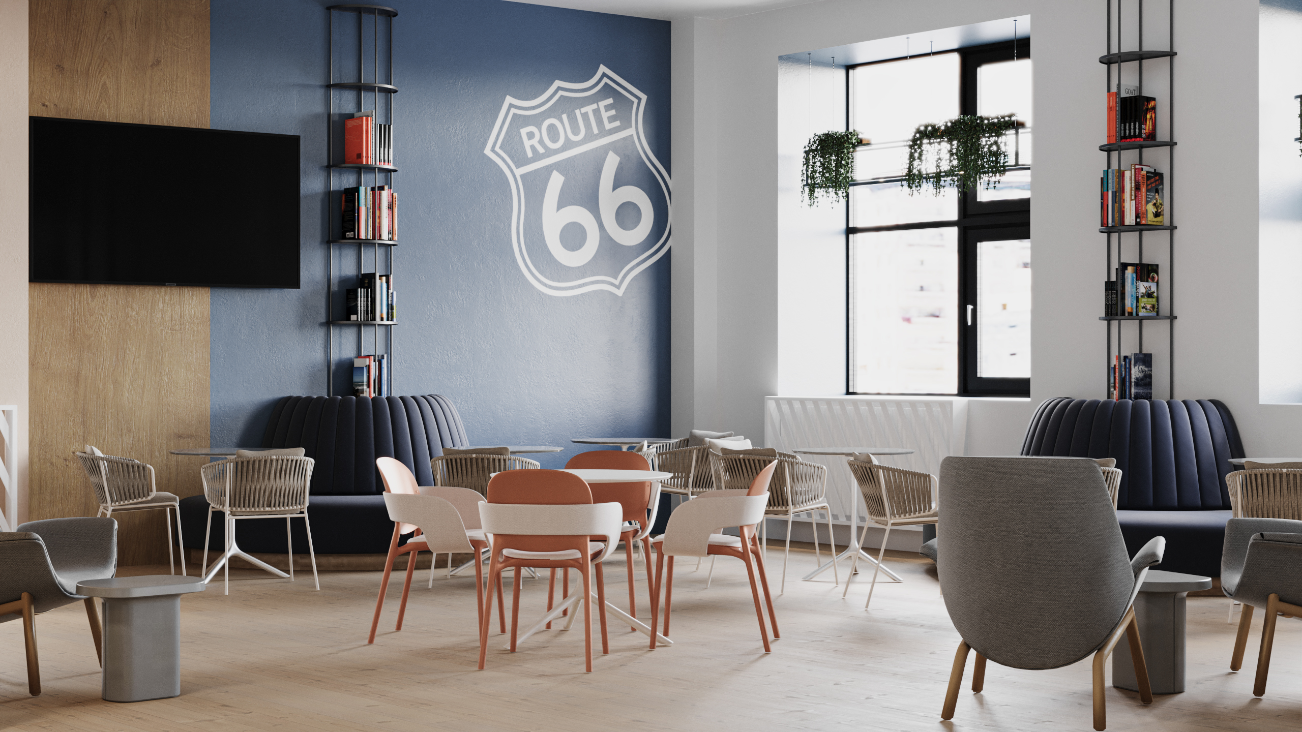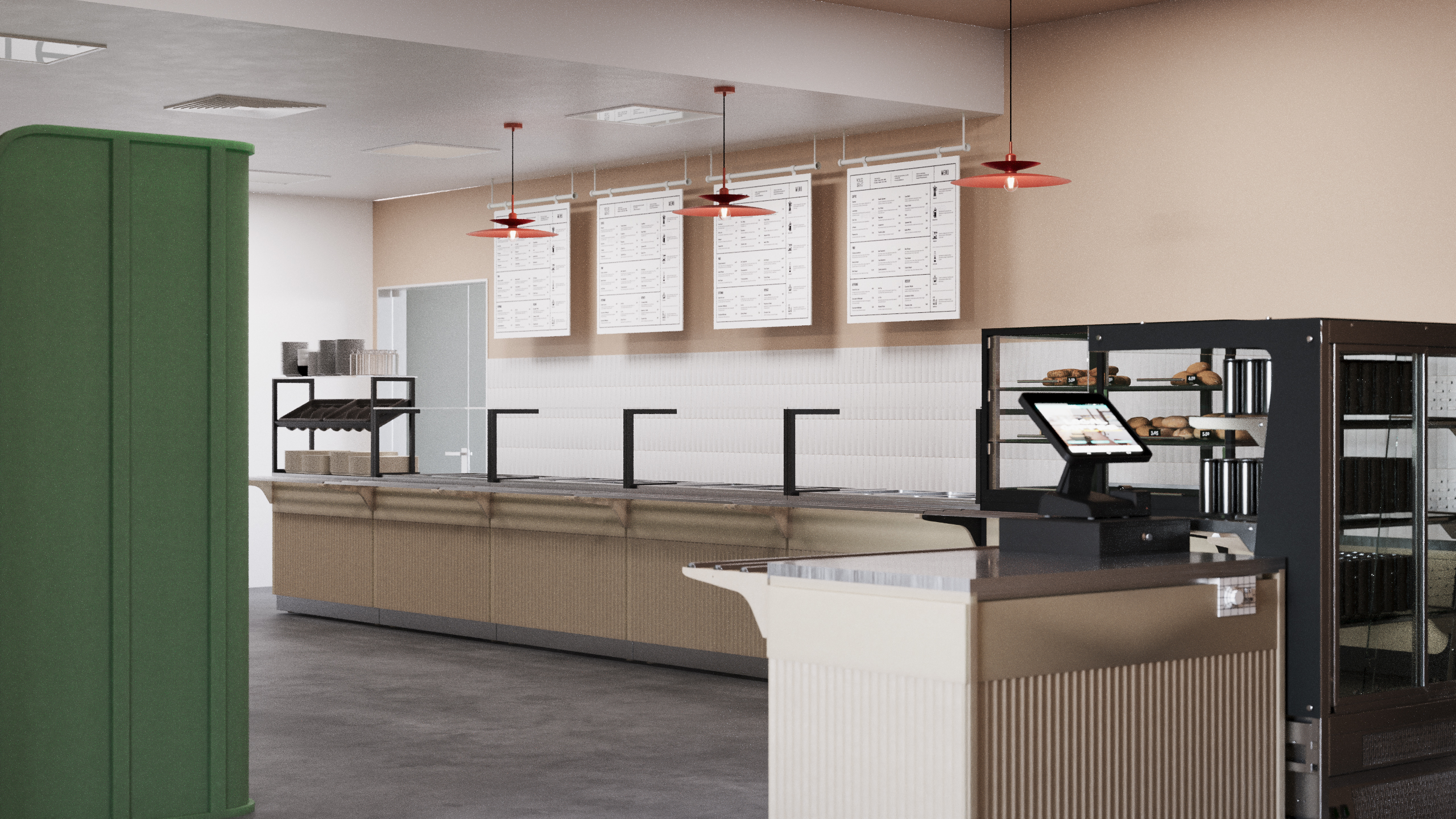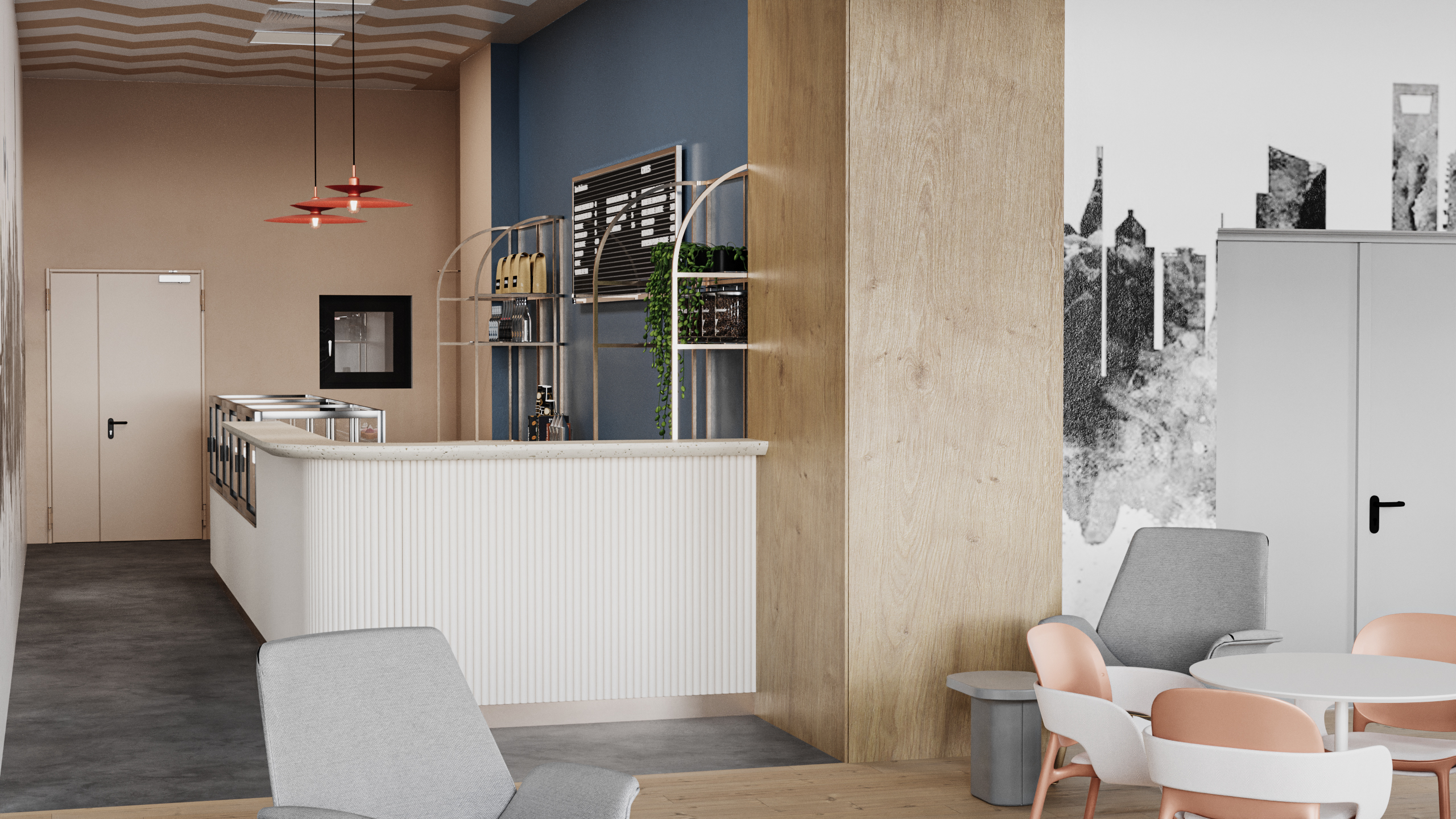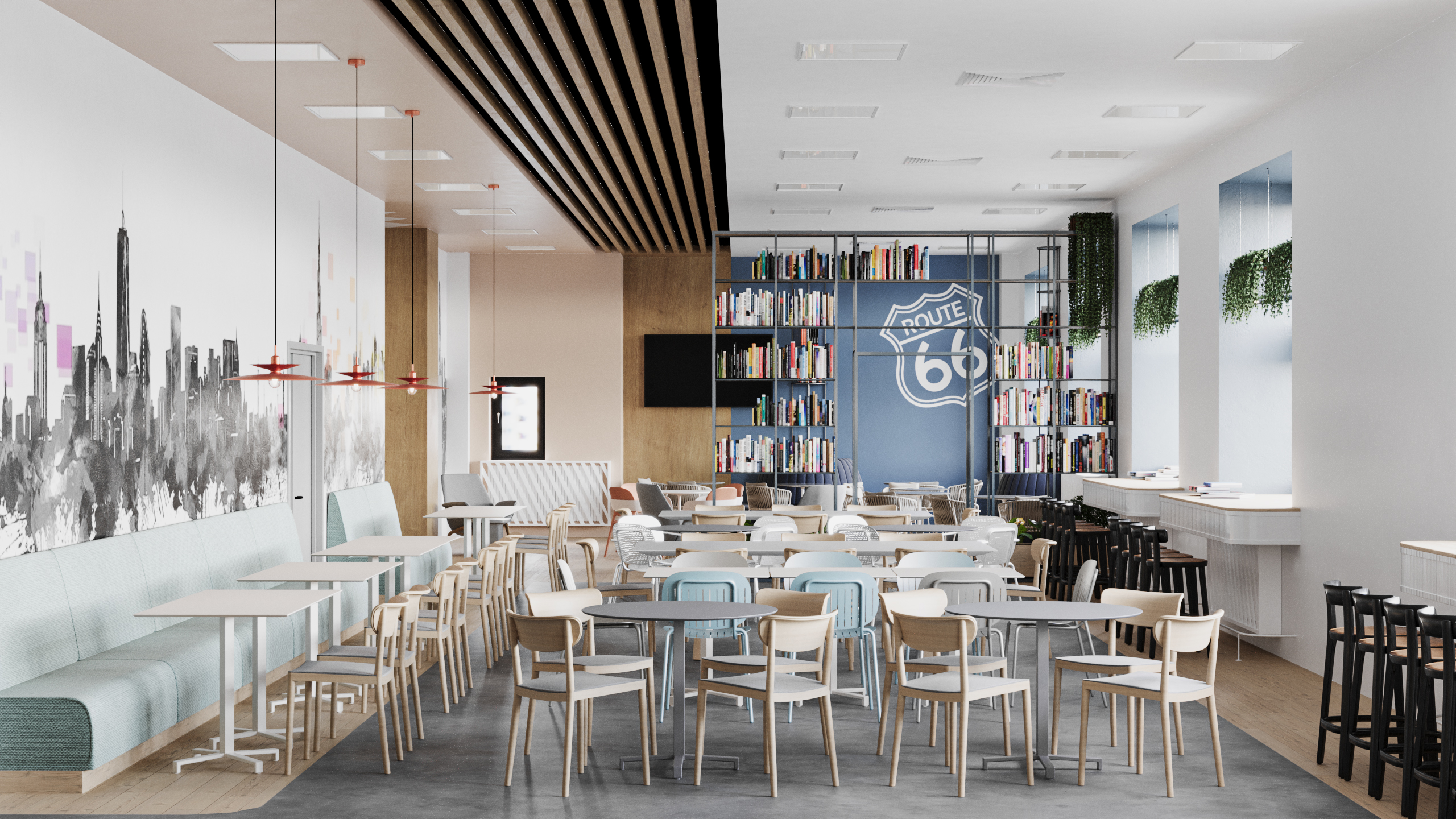 Restaurant de tip self service amenajat in cadrul unei facultati din Bucuresti. Design de interior este unul contemporan, cu accente scandinave. Gama cromatica este una vie adaptata pentru utilizatori tineri. Efectul de lemn reda caldura iar plantele integrate rup geometrie mobilierului.